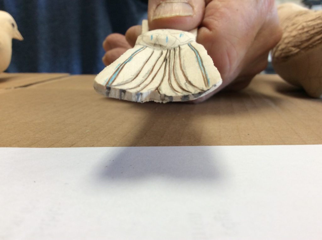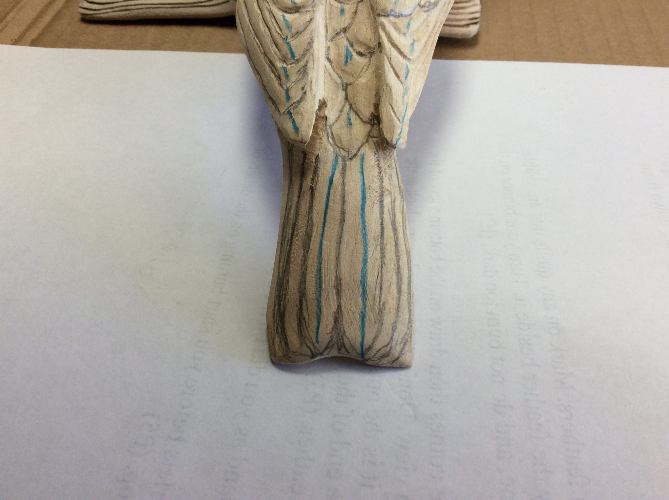 At this time you will need to sand down the tail to create the illusion of it being feather thin. Taper the top down all around to make the edge appear thin. Leave the centre area thicker to add strength. Be sure to redraw in the upper and lower tail coverlets, that you created when you were ruffing in the tail.