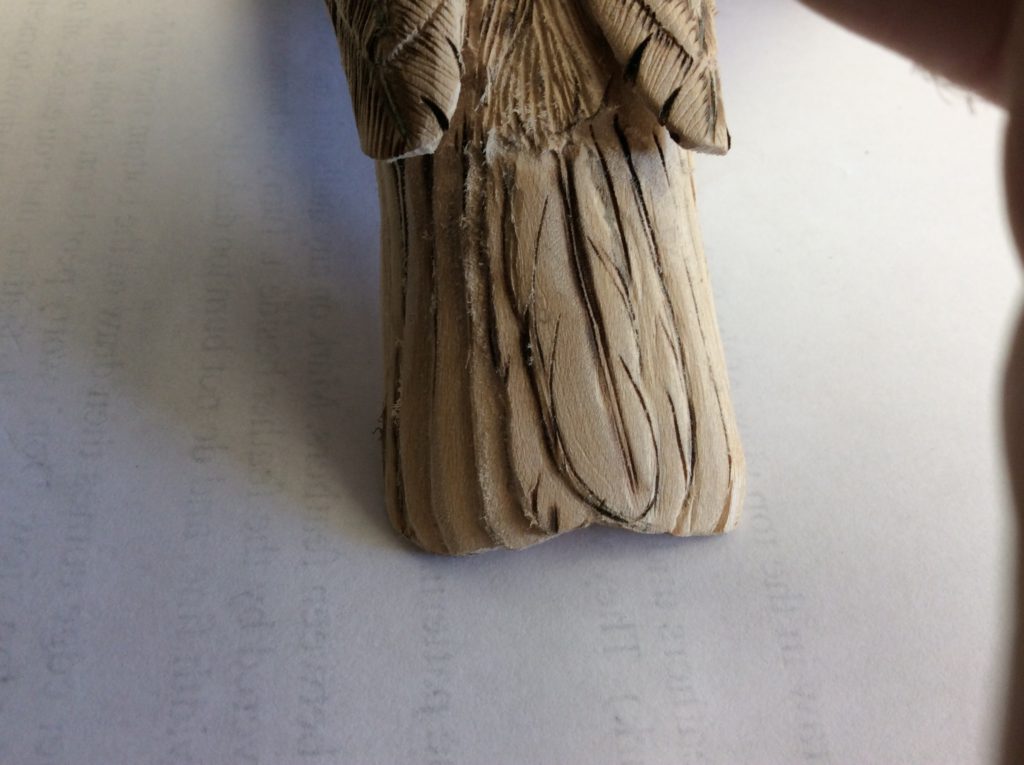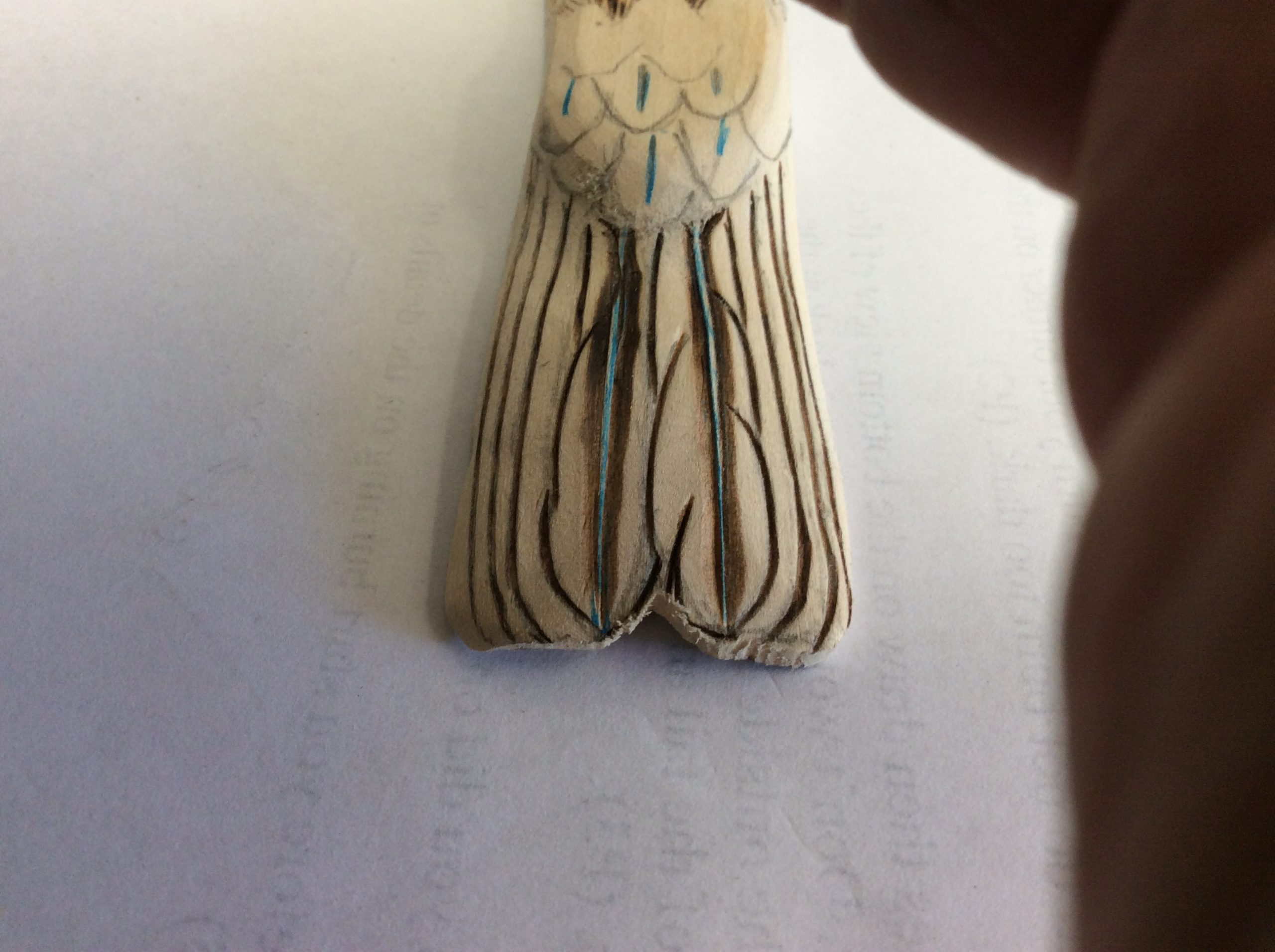 Re check the edges and end of the tail. Sand the top down to meet the bottom where necessary to create the illusion of a thin feather. Re draw your lines and re burn if needed. When you are happy with the feather layout, texture them with your burner. Keep the lines very close and curve them a little. Think about feather splits if you want to add interest.