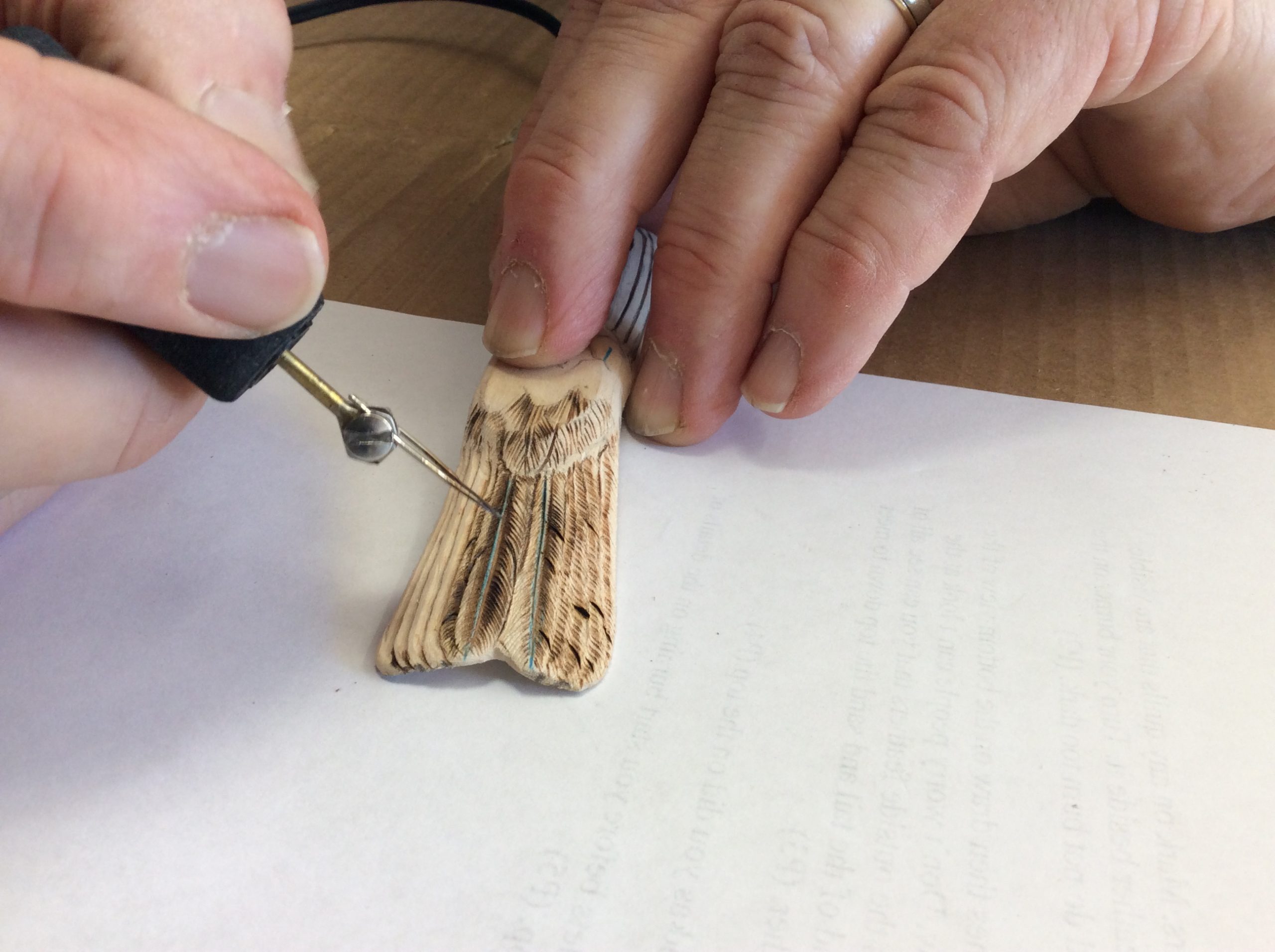 Cut or burn the edges of these feathers and then relieve them with a knife or by turning your burner tip on it’s side and lightly create an edge for each feather. (Not too deep and not too dark).