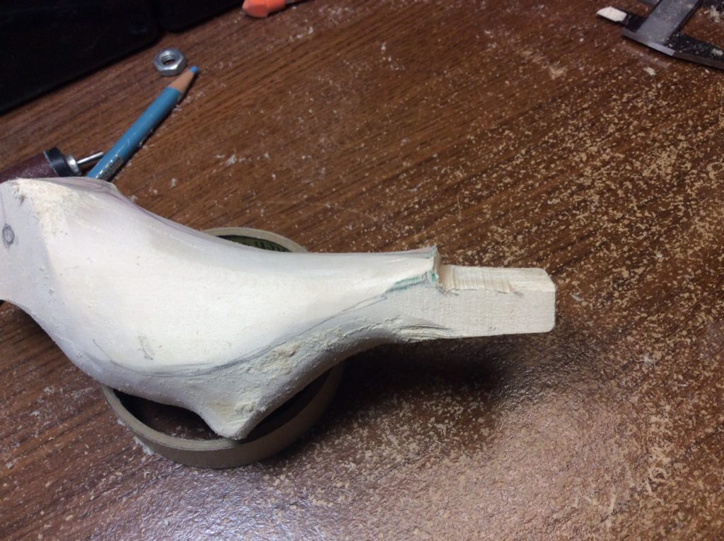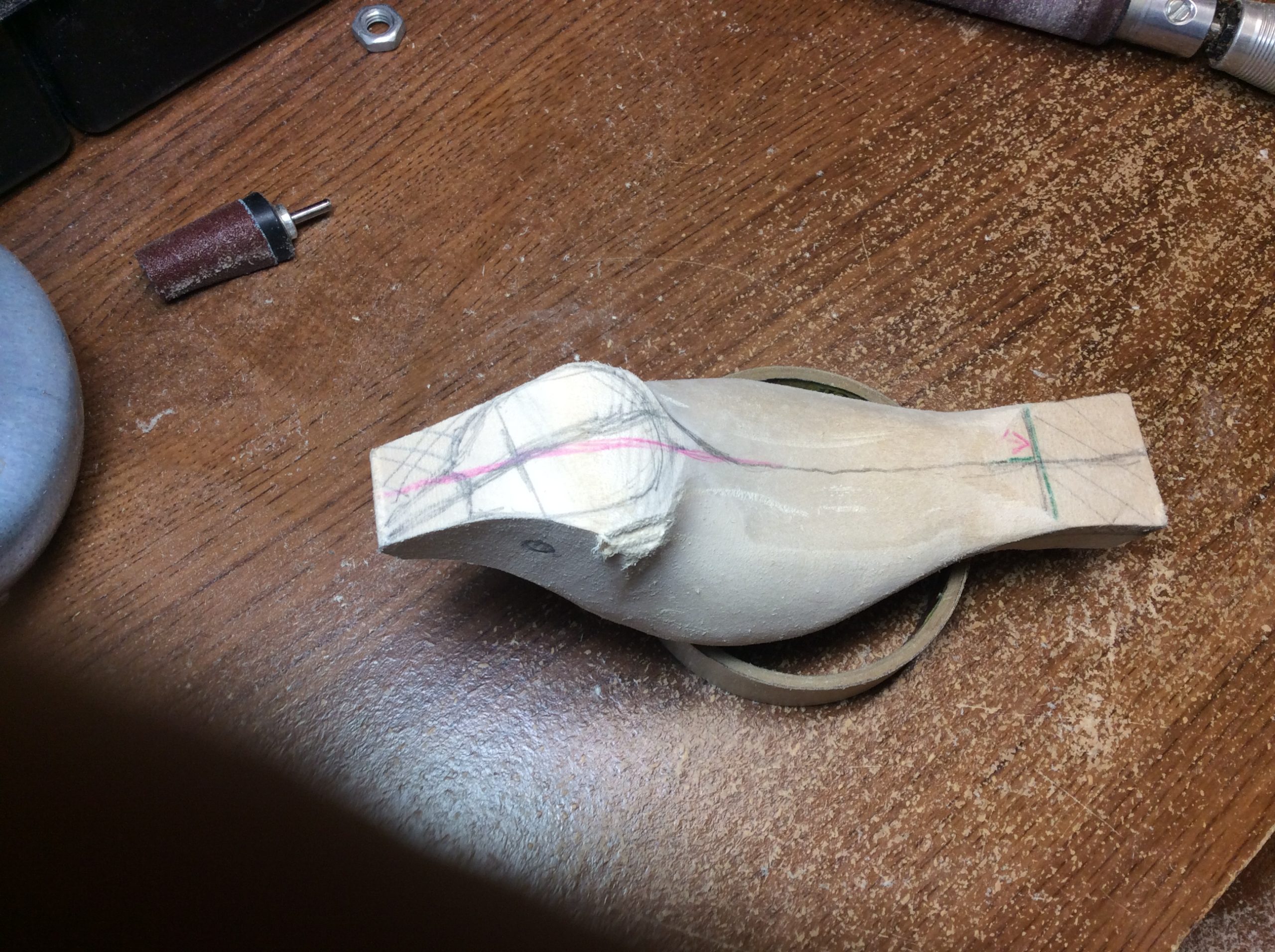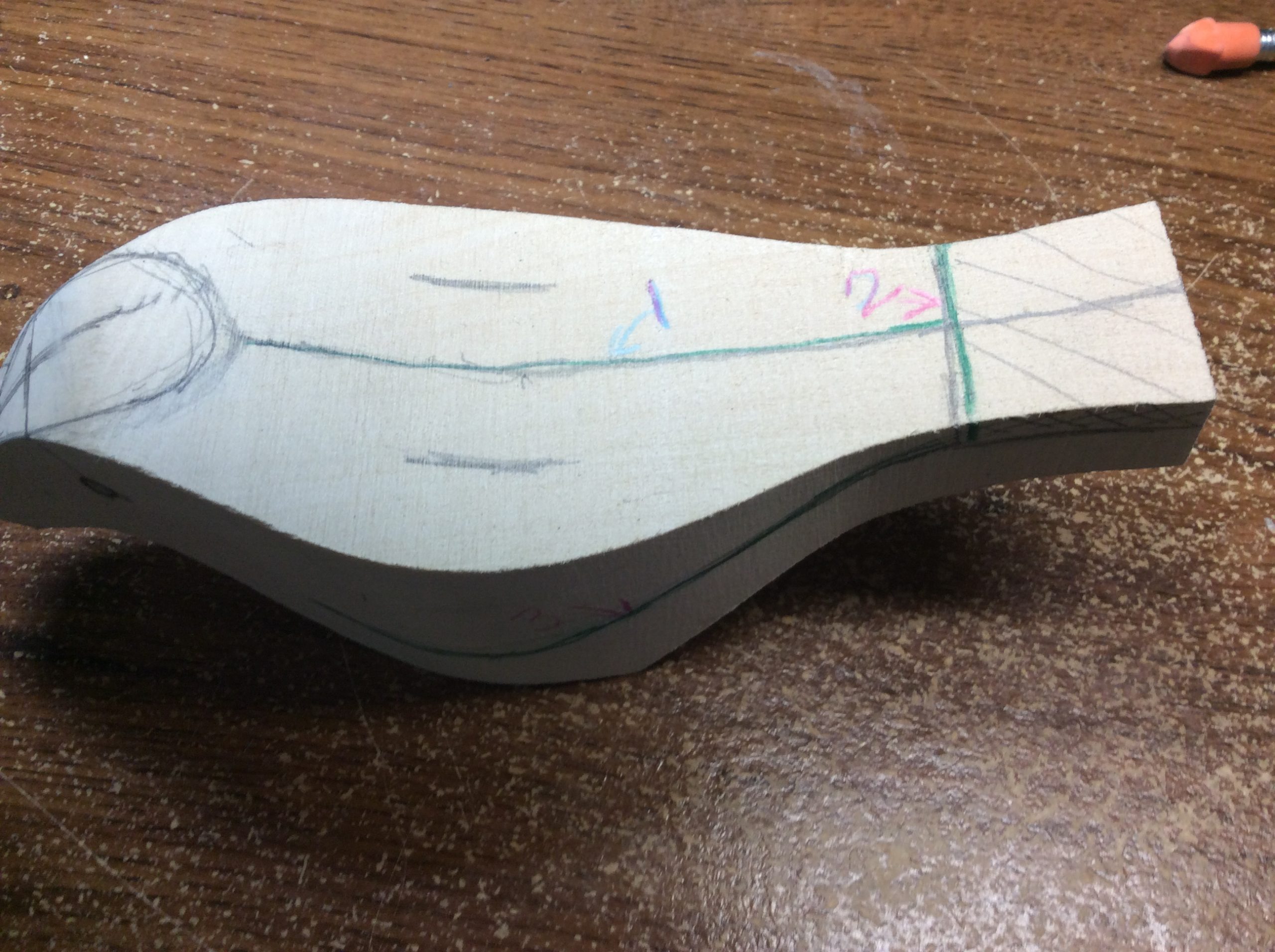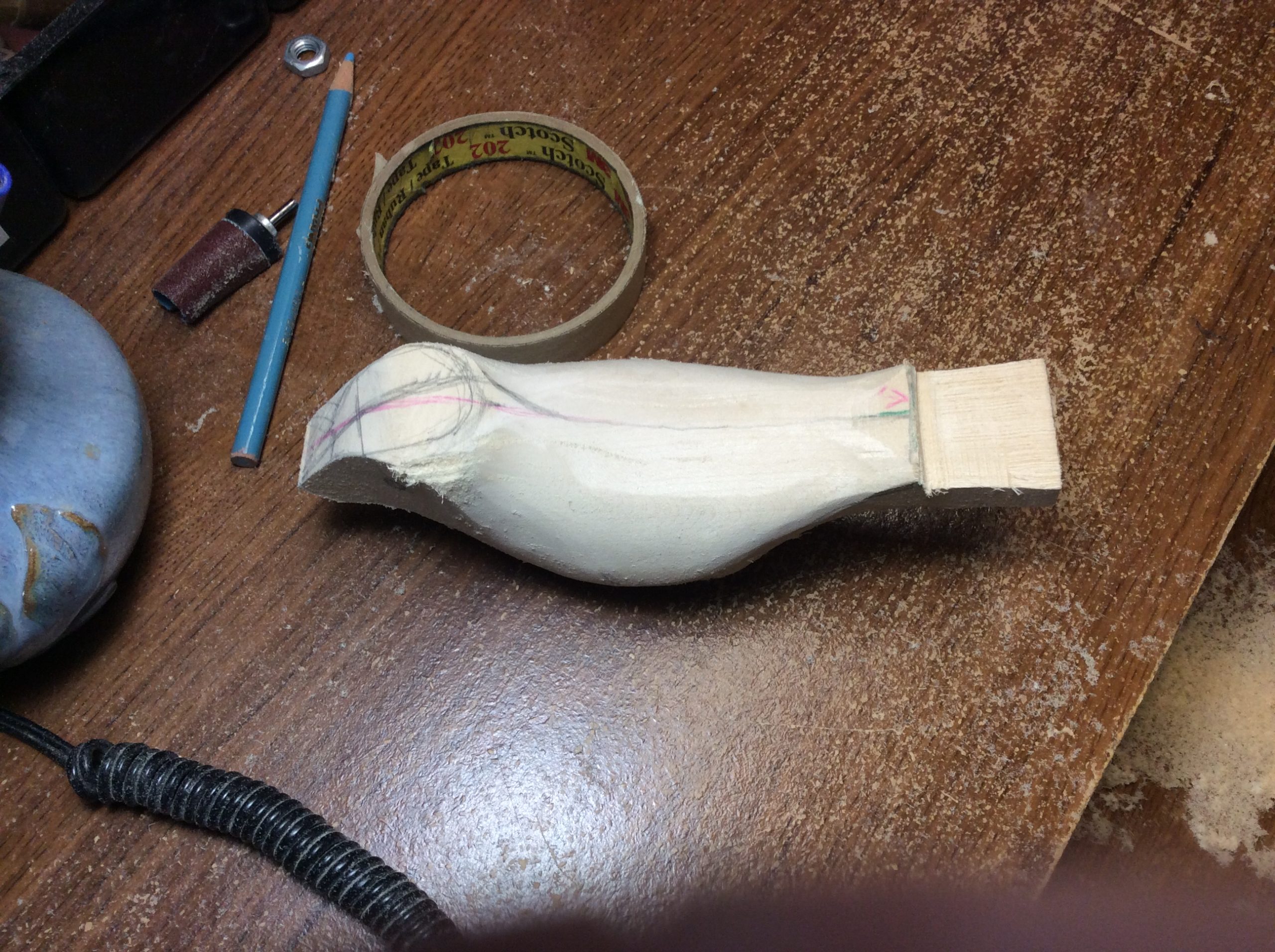 Round the back from the centre line down to the wing edge on both sides. Check frequently to be sure that both sides are similar, and they curve. Leave the head and tail area for now.
