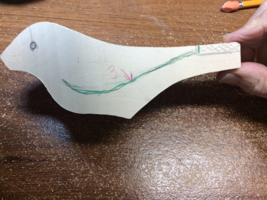 From the pattern, measure and draw lines across the top of the head at right angles, to mark on the top of the beak and the eye position. This can to done at this time for straight or turned heads.